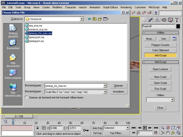 The export script is now loaded and added to the dropdown list on the MaxScript rollout. Select the item named